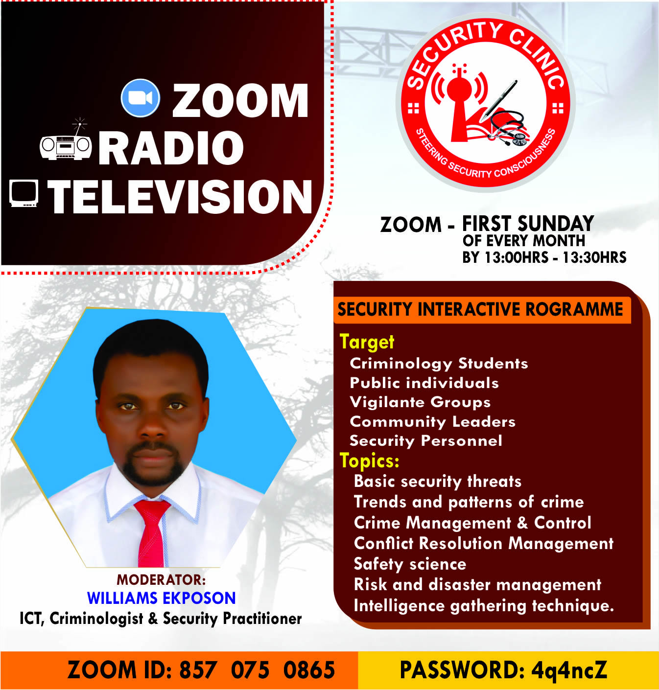 This is online (zoom),radio and television interactive programme developed and anchored to educate the public on basic security threats with time /season, safety science ,risk and disaster management, trends and patterns of crime in Nigeria localities and how to curb it using intelligence policing system. It’s a community service programme organized to create a collective security culture.